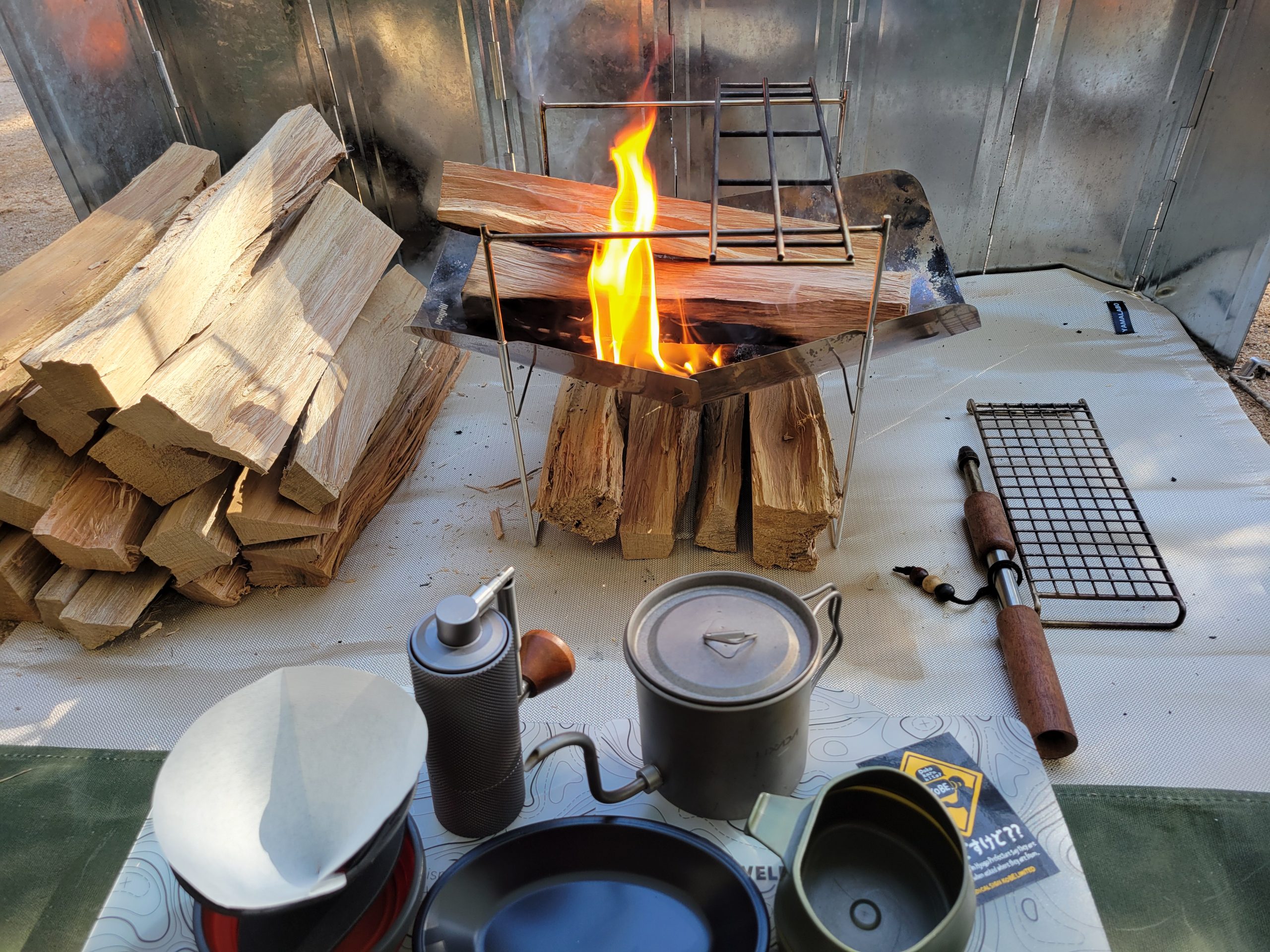 昼間のキャンプでは、焚き火台に薪を組み、ケトルでお湯を沸かしてコーヒータイム。